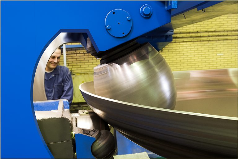 “The production process is exactly the same. We just press it slightly less far through. The press keeps stamping until the right radius is achieved. That might differ by 10 or 15 centimetres, but the process itself doesn’t really change. Throughout production, the shape of the head is constantly measured using a template, and once the head is finished, we make a measurement report to verify that it meets all required tolerances,” says Hofman.